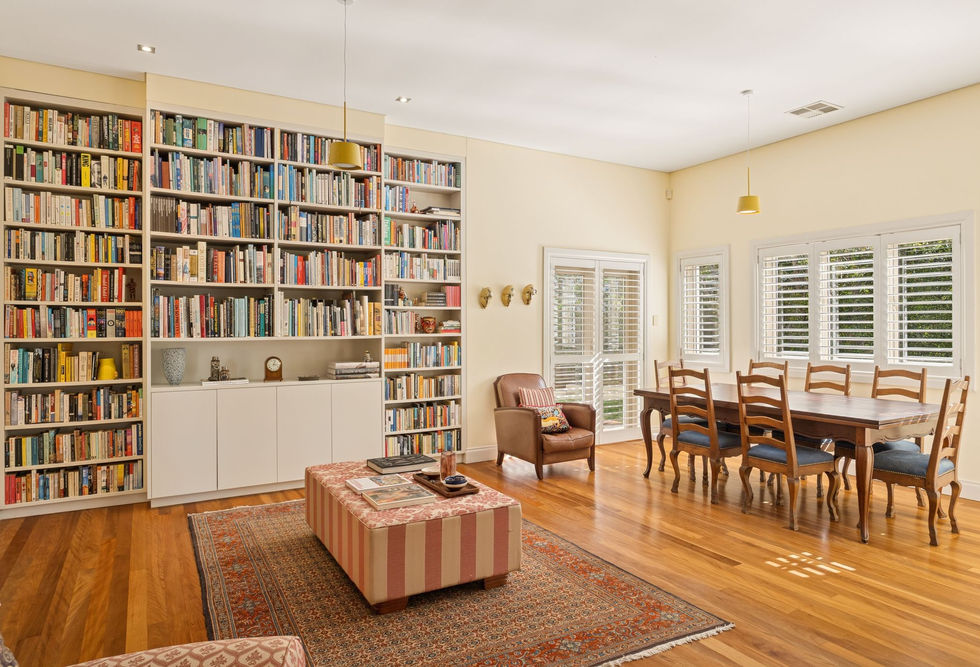 Expansive living/dining zones enhanced with double-height ceilings, highlight windows and custom library cabinetry