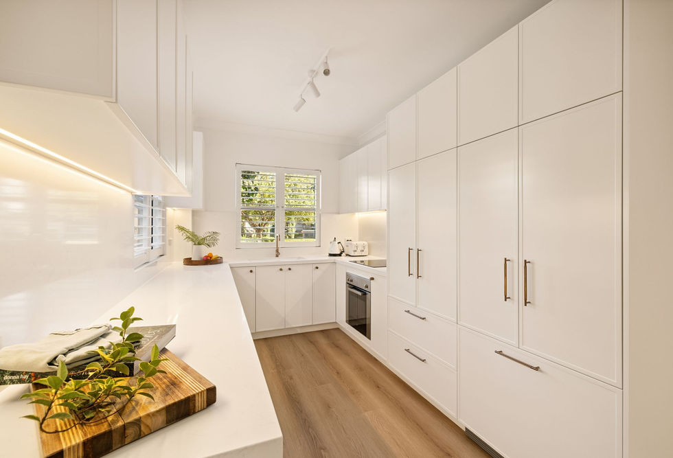 Modern kitchen features integrated appliances, stone bench tops and a dishwasher
