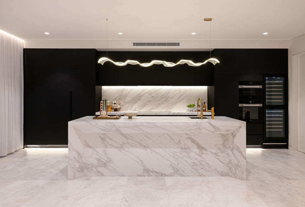 Designer Miele gas kitchen, Italian spec marble countertops, b'fast bar